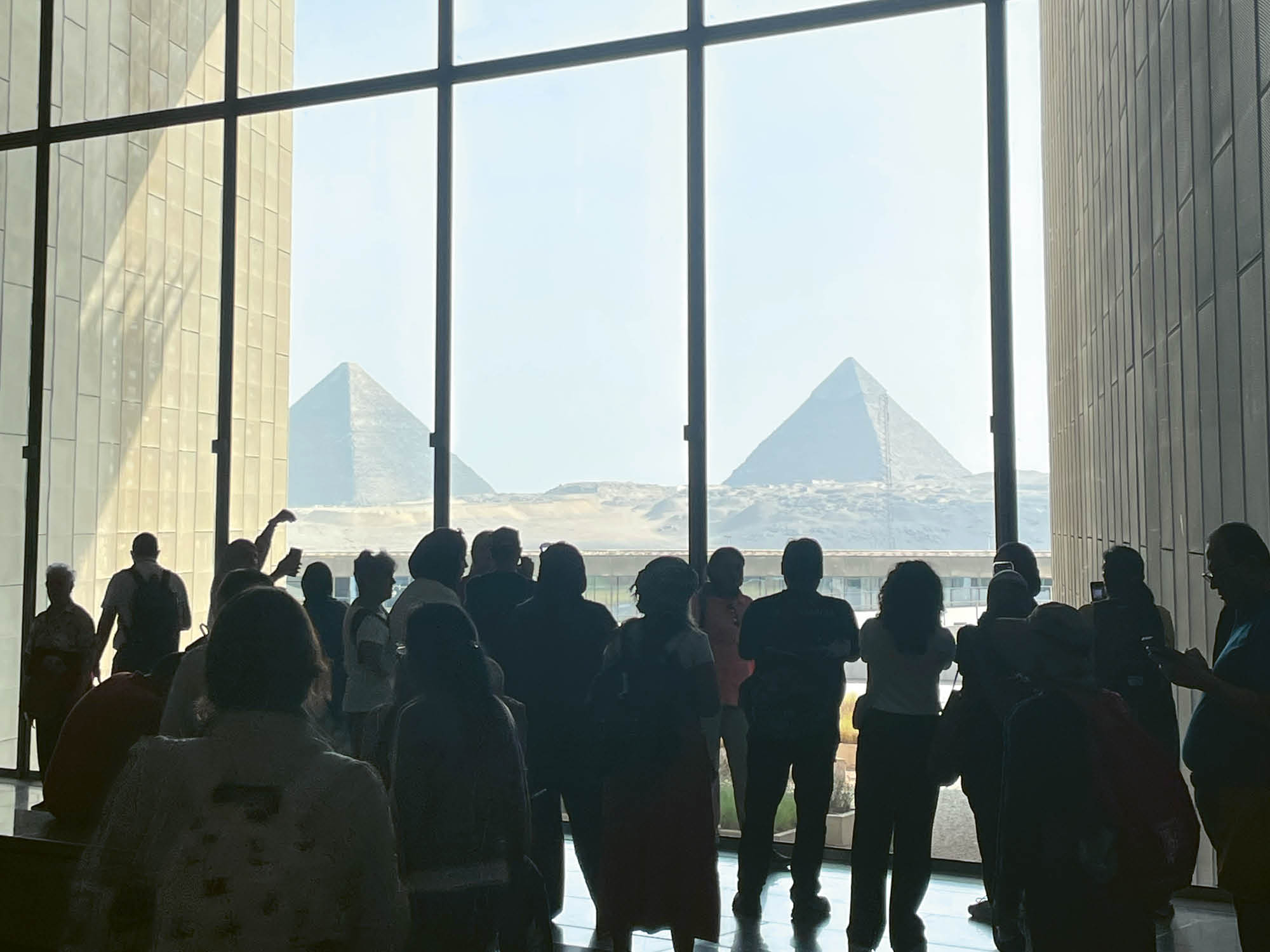 Les écrans des téléphones portables reflètent les traits de pierre des statues, ces archétypes de la grandeur humaine. Pourquoi photographie-t-on autant ? Probablement parce que nous avons perdu confiance en nos yeux. Mais le musée nous aide à la retrouver. Si, à l’entrée, nous avons ressenti l’attraction de l’histoire, nous faisons maintenant l’expérience, non moins physique, de la montée. L’histoire élève ! Au bout de 150 marches, on arrive en haut et on aperçoit les trois pyramides de Gizeh à travers de grandes baies vitrées. Tout comme le musée de l’Acropole à Athènes, inauguré en 2009, le nouveau musée égyptien bénéficie d’un emplacement idéal. Une fois détaché de la vue sur les pyramides, on descend progressivement à travers douze salles.